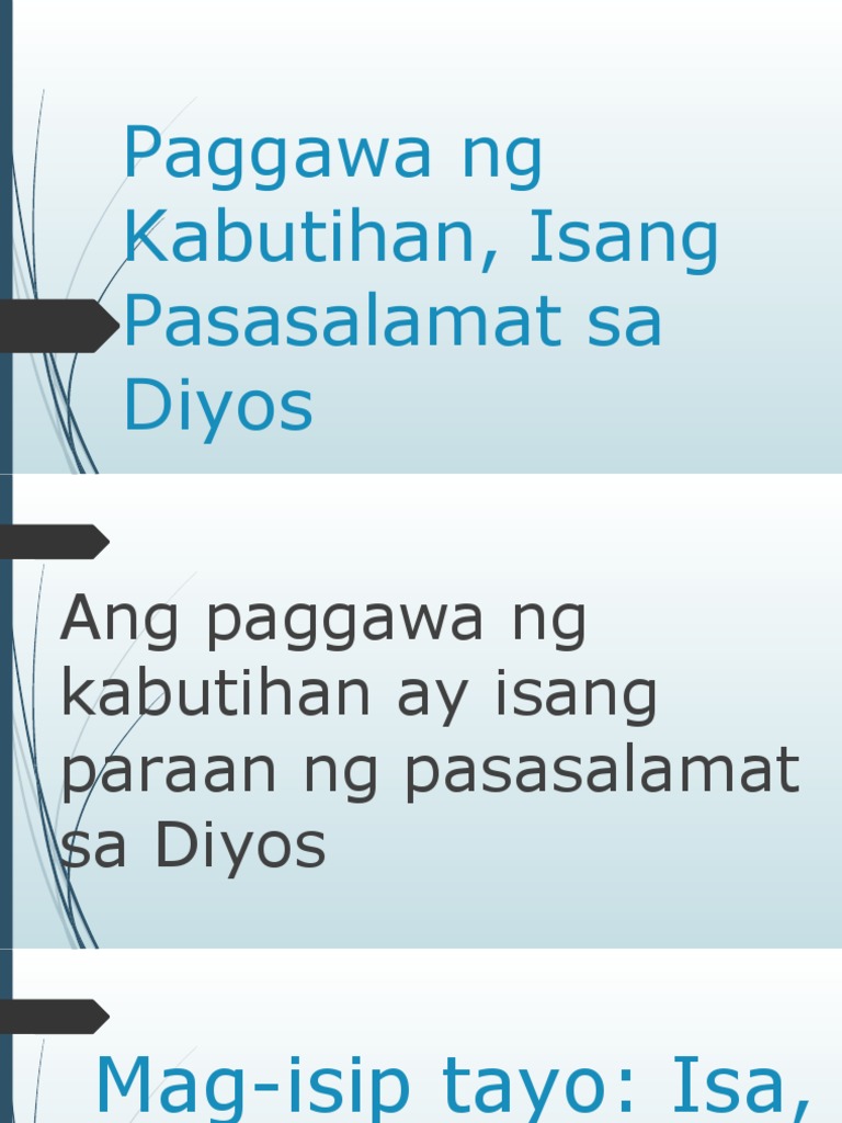 Paggawa ng Mabuti Sa Kapwa By. Ito ang nagtutulak sa kaniya upang magkaroon ng Kagalingan Mga Katangiang Dapat Taglayin. Ditablan EsP 9 Ayon kay Pope John Paul II 1981 sa kaniyang isinulat na Laborem Exercens Ang paggawa ay mabuti sa tao dahil sa pamamgitan nito naisasakatuparan niya ang kaniyang responsibilidad sa sarili kapwa at sa Diyos.
