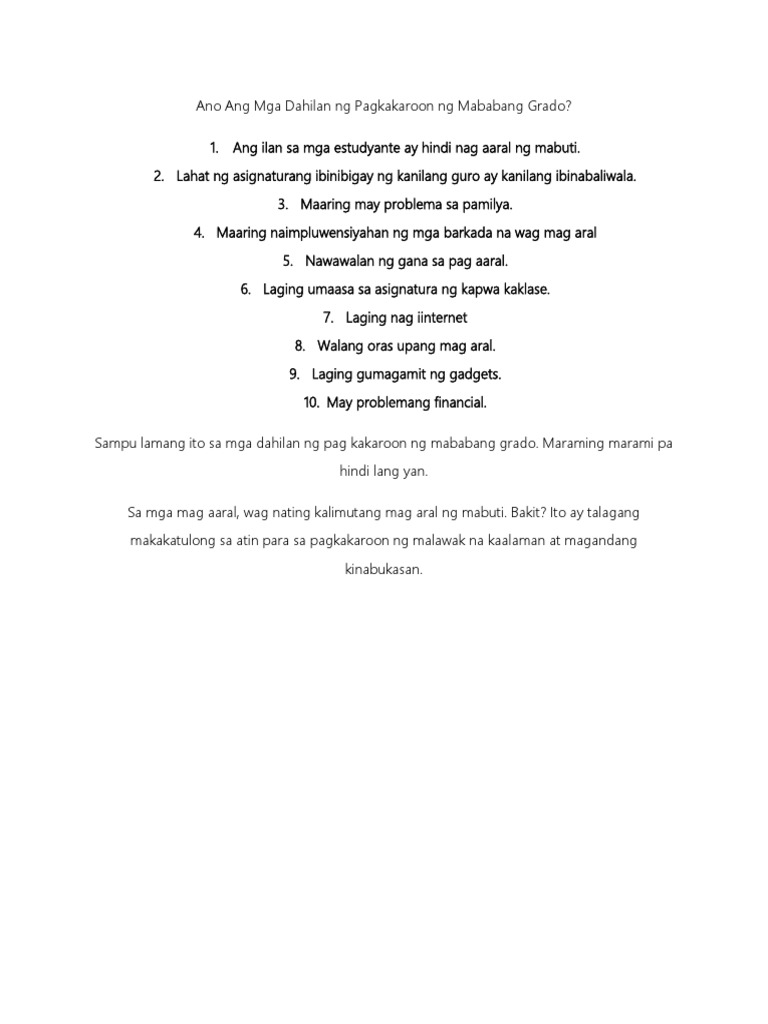 Meron tayong trabahong matatanggap na maganda at kapag tayo ay mag-aasawa hindi na tayo mahihirapan sa pag-aalaga ng ating mga magulang o pamilya dahil meron na tayong trabahomagandang buhay at dahilan ito sa pag-aaral ng mabuti. Ngunit paano mangyayaring maging susi ito sa isang magandang bukas kung hindi lahat ng kabataan ay nabibigyan ng pagkakataong makapag-aralhigit pa dito paano sila matatawag na. View COGALdocx from ECE COM01 at Rizal Technological University.