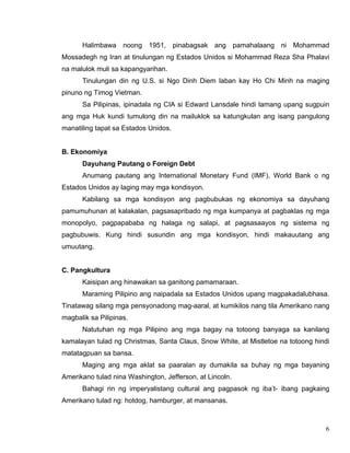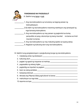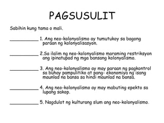 Kung ito ay isang makasaysayang pangyayari lamang. Naipapahayag ang mga mabuti at di mabuting eoekto ng neokolonyalismo at c. Kanilang gusto sa malalayang bansa.