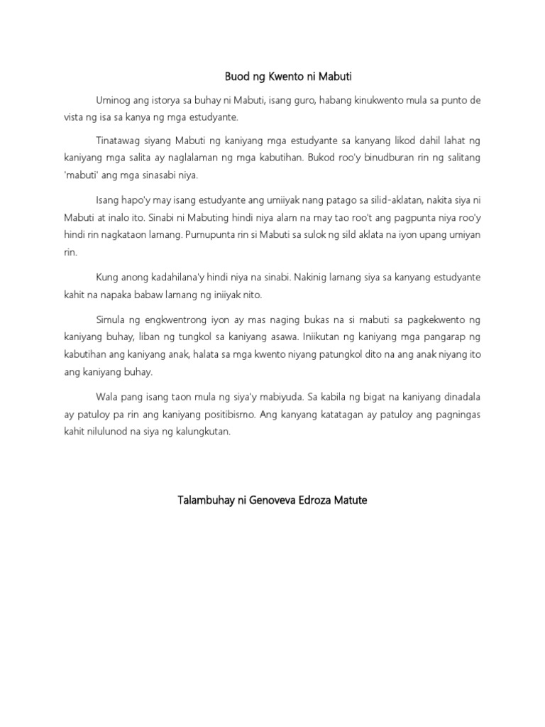 Kaisipan ng kwento ni mabuti. Ang realidad hindi lahat sa buhay ay mabuti. Ang Kwento ni Mabuti Ni Genoveva Edrozo Matute May pakpak ang balita may tainga ang lupa Buod Uminog ang kwento sa buhay ni Mabuti isang guro habang kinukwento mula sa punto de vista ng isa sa kanya ng mga estudyante. Sa mga taong kasangkot sa tula.